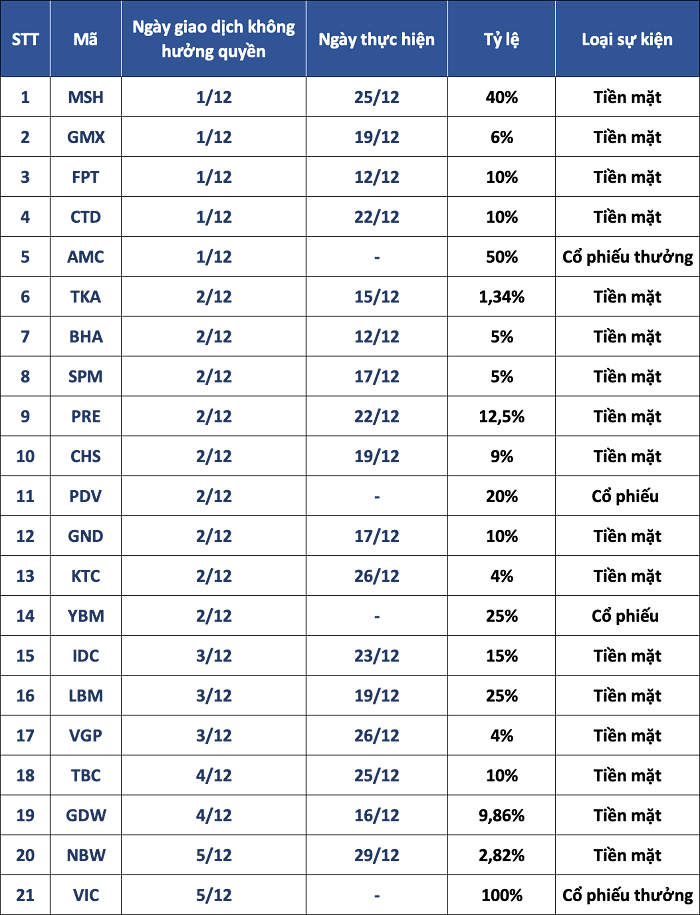 Trong tuần từ 1/12 đến 5/12, thị trường chứng khoán có 21 doanh nghiệp chốt ngày giao dịch không hưởng quyền để nhận cổ tức tiền mặt, cổ phiếu.