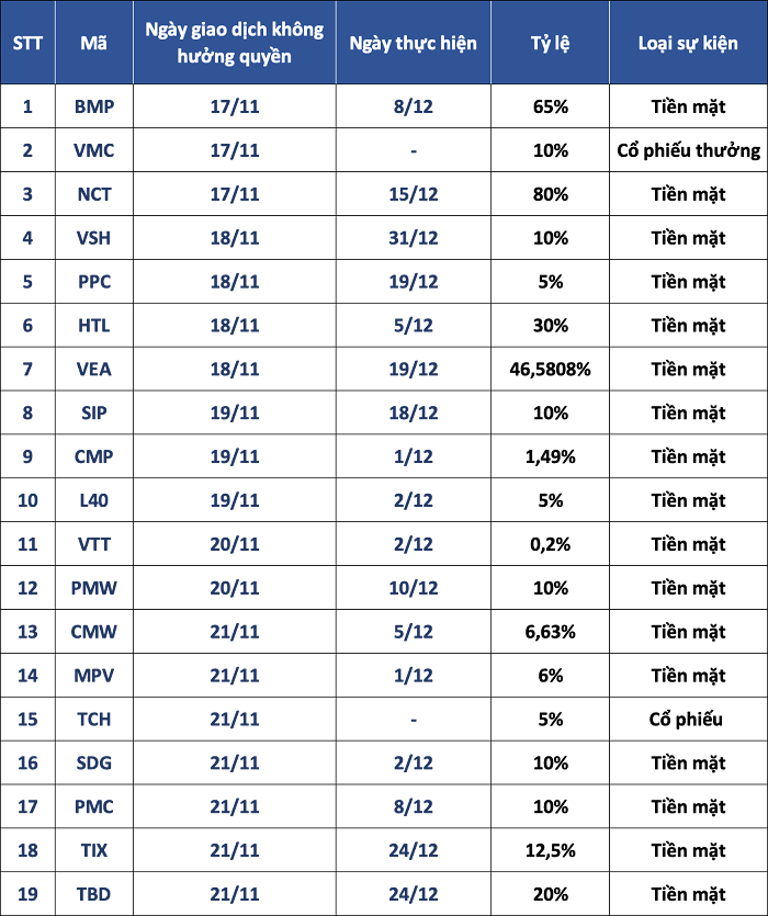 Trong tuần từ 17/11 đến 21/11, thị trường chứng khoán có 19 doanh nghiệp chốt ngày giao dịch không hưởng quyền để nhận cổ tức tiền mặt, cổ phiếu.