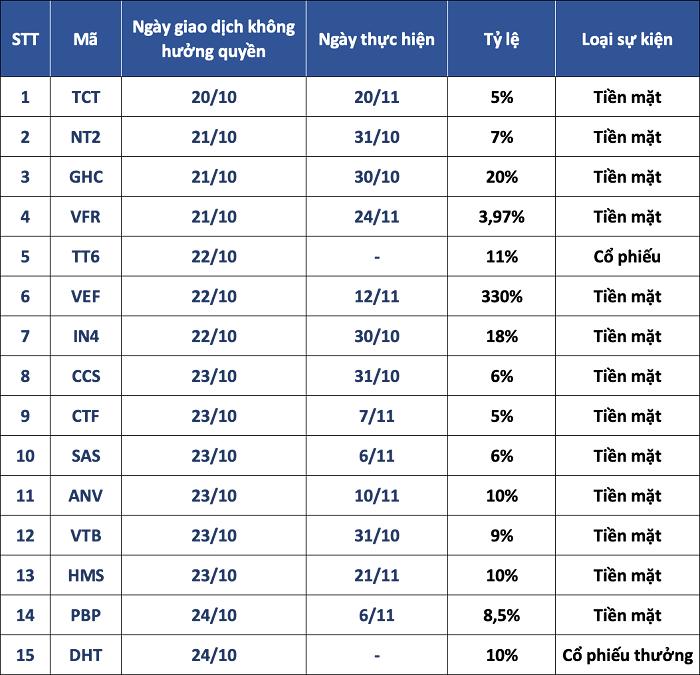 Trong tuần từ 20/10 đến 24/10, thị trường chứng khoán có 15 doanh nghiệp chốt ngày giao dịch không hưởng quyền để nhận cổ tức tiền mặt, cổ phiếu.