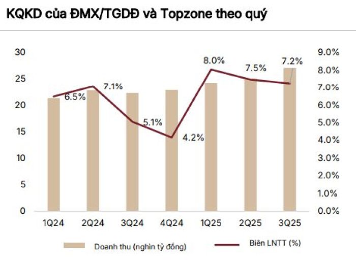 Đối với mảng sản phẩm công nghệ và điện máy , SSI cho rằng nhu cầu thay mới điện thoại, laptop và các chính sách giảm thuế sắp triển khai sẽ tiếp tục hỗ trợ tăng trưởng lợi nhuận. Nhờ kết quả kinh doanh quý III vượt kỳ vọng, SSI điều chỉnh tăng dự báo lợi nhuận 2025 - 2026.