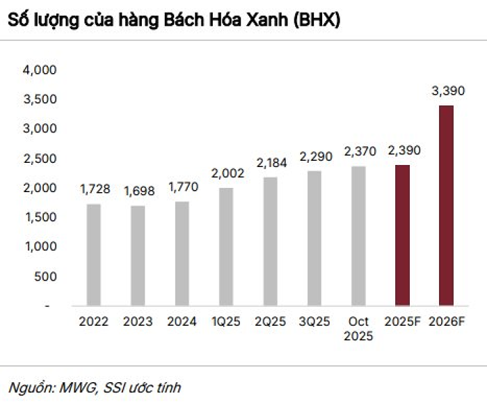 Theo định hướng ban lãnh đạo, MWG có kế hoạch mở mới 620 - 1.000 cửa hàng BHX trong giai đoạn 2025 - 2026. Năm 2026, Capex dự kiến tập trung cho đầu tư công nghệ thông tin, hệ thống kho bãi và logistics nhằm hỗ trợ mở rộng mạng lưới và tối ưu hóa vận hành. Phần lớn cửa hàng mới sẽ được mở tại miền Trung và miền Nam, trong khi miền Bắc được triển khai thận trọng hơn, bắt đầu từ Ninh Bình. SSI nhận định miền Bắc là thị trường tiềm năng nhưng mức độ cạnh tranh cao do sự hiện diện mạnh của WinMart, đặc biệt trong việc thấu hiểu hành vi người tiêu dùng địa phương.