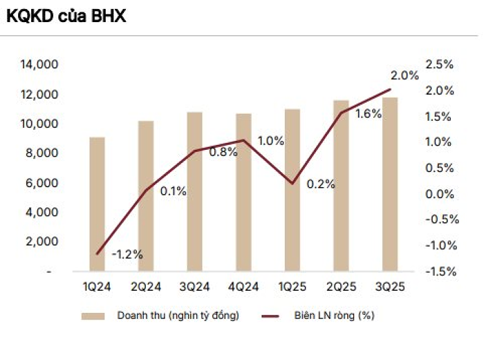 Đối với Bách Hóa Xanh , SSI kỳ vọng chuỗi bách hóa sẽ hưởng lợi lớn từ thay đổi chính sách thuế áp dụng cho hộ kinh doanh cá thể, chuyển từ thuế khoán sang thu thuế theo doanh thu. Chính sách này được cho là sẽ thúc đẩy nhanh xu hướng dịch chuyển từ bán lẻ truyền thống sang bán lẻ hiện đại. BHX đã cải thiện biên lợi nhuận trong quý III, qua đó giúp SSI nâng dự báo lợi nhuận giai đoạn 2025 - 2026.