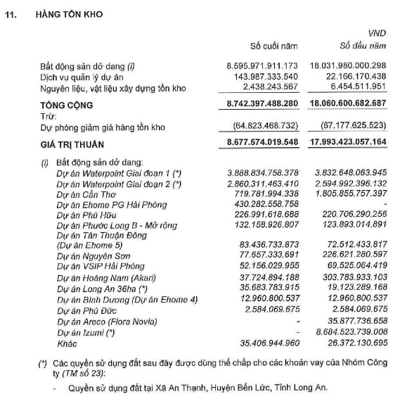 Về cấu trúc tài sản, tổng tài sản của NLG tại ngày 31/12/2025 đạt 26.564,51 tỷ đồng, giảm 12,38% so với đầu năm. Điểm đáng chú ý nhất là giá trị hàng tồn kho giảm mạnh 51,77%, từ mức 17.993,42 tỷ đồng xuống còn 8.677,57 tỷ đồng. Trong đó, dự án Izumi đã ghi nhận giảm toàn bộ giá trị tồn kho từ hơn 8.684,52 tỷ đồng về 0 sau khi chuyển đổi từ công ty con thành công ty liên doanh, dự án Cần Thơ giảm hơn một nửa, xuống chỉ còn 719,7 tỷ đồng, …