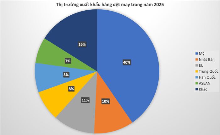 Mỹ tiếp tục là thị trường xuất khẩu lớn nhất của dệt may Việt Nam, chiếm trên 40% tỷ trọng xuất khẩu. Hàng dệt may của Việt Nam tại Mỹ hiện tại chiếm 17,1% thị phần (xếp sau Trung Quốc với 18,2%). Tuy nhiên, nếu tính riêng hàng may mặc thì Việt Nam đứng thứ nhất với 20,9% thị phần (Trung Quốc chiếm 15%).