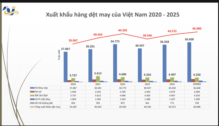 Theo số liệu của Hiệp hội Dệt may Việt Nam (VITAS), kim ngạch xuất khẩu hàng dệt may của Việt Nam trong năm 2025 đạt khoảng 46 tỷ USD, tăng 6% so với cùng kỳ năm ngoái.