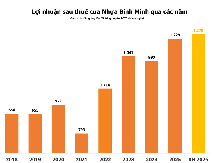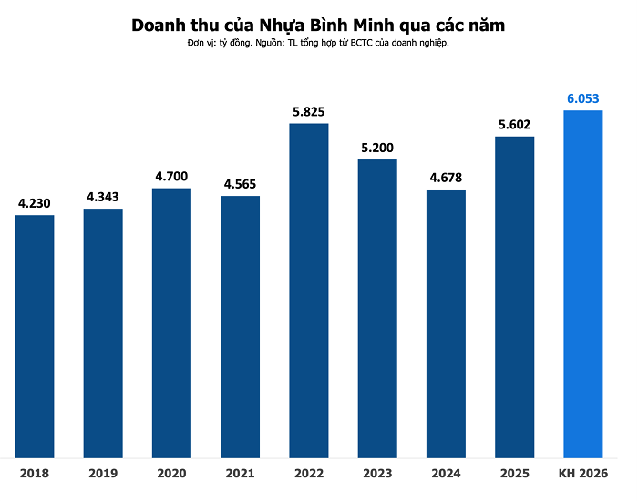 Năm 2026, Nhựa Bình Minh dự kiến doanh thu tăng gần 8% so với năm 2025, trong khi lợi nhuận sau thuế ước đạt 1.278 tỷ đồng, tương ứng mức tăng 4% so với năm trước.