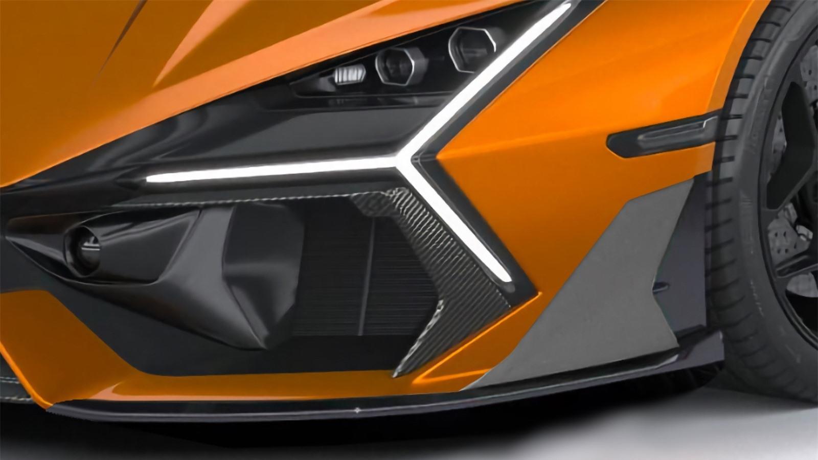 Phần đầu xe được bổ sung thêm các tấm ốp bằng sợi carbon mang phong cách của siêu xe Aventador SV/Aventador SVJ nhằm tăng tính khí động học của Revuelto.