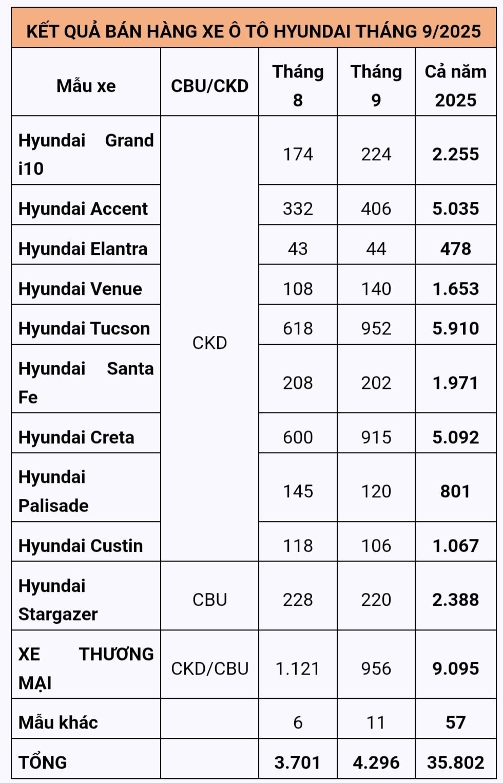Theo công bố, Hyundai Tucson là mẫu xe có số lượng bán hàng tốt nhất tháng 9/2025, với 952 xe đến tay khách hàng, tăng trưởng 54% so với tháng 8/2025. Hyundai Creta đứng ở vị trí thứ 2 với 915 xe bán ra, tăng trưởng 52,5% so với tháng trước đó. Hyundai Accent ghi nhận doanh số 406 xe, đứng ở vị trí thứ 3, tăng trưởng 22,3% so với tháng 8.