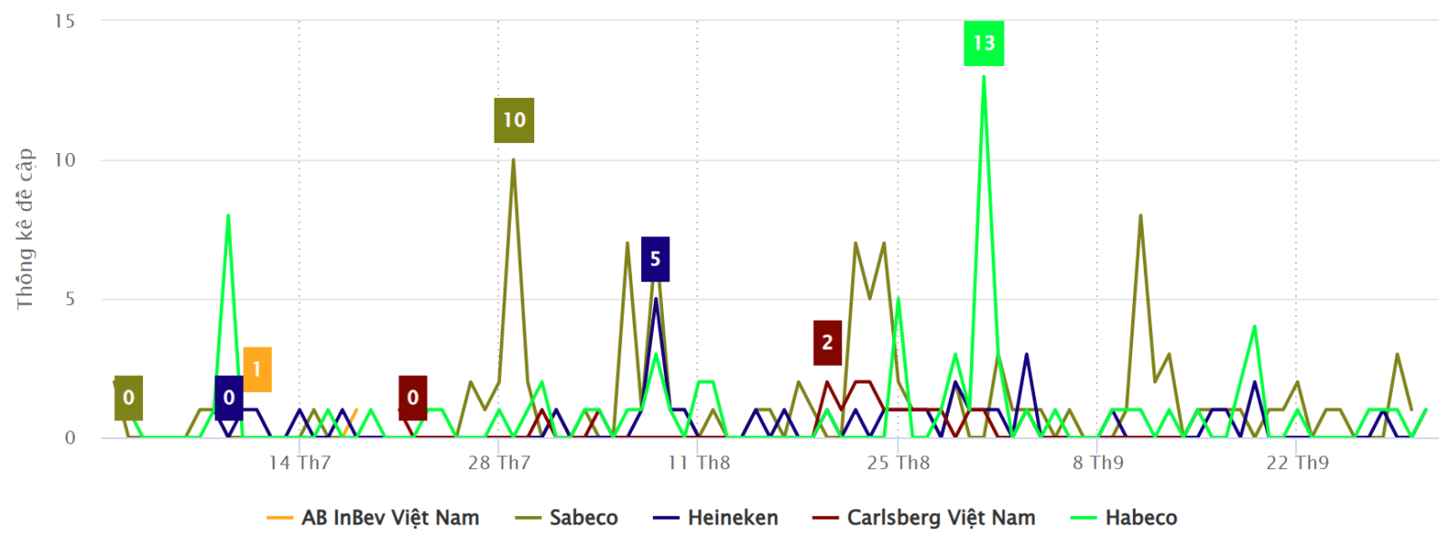 Thị trường bia quý trong III/2025 ghi nhận mức độ cạnh tranh ngày càng gia tăng với sự hiện diện của nhiều thương hiệu lớn như Heineken (Bia Heineken, Strongbow cider, Tiger beer, Bia Larue)Sabeco (Bia Saigon, Bia 333, 333 beer, Sabeco beer)Habeco (Bia Hà Nội, Habeco beer, Bia Trúc Bạch, Habeco Gold), Carlsberg Việt Nam (Bia Huda, Bia Halida, Tuborg beer, Carlsberg Vietnam)AB InBev Việt Nam (Bia Budweiser, Budweiser Vietnam, Beck's beer, Corona beer). Báo cáo do Vibiz thực hiện phân tích chi tiết về sắc thái thương hiệu, thông qua các chỉ số như mức độ đề cập, lượng tương tác và phản hồi từ người tiêu dùng. Mục tiêu giúp phác họa bức tranh toàn cảnh về mức độ hiện diện và sức ảnh hưởng của các thương hiệu bia, từ đó hỗ trợ doanh nghiệp xác định rõ góc nhìn truyền thông hiện tại và định hướng chiến lược xây dựng thương hiệu hiệu quả hơn.