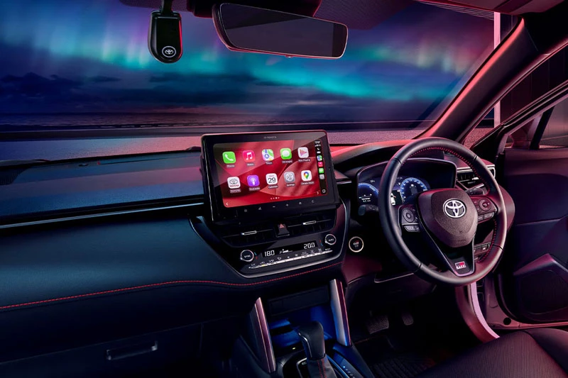 Bên trong khoang cabin, Toyota Corolla Cross HEV GR Sport 2026 tiếp tục duy trì tông màu đen chủ đạo, đồng thời bổ sung nhiều chi tiết nhấn nhá tinh tế nhằm tăng cảm giác thể thao. Đường chỉ khâu màu đỏ không chỉ xuất hiện trên vô lăng, cần số và ghế ngồi như trước mà còn được mở rộng sang bảng táp-lô và các tấm ốp cửa, tạo sự liền mạch về thiết kế.