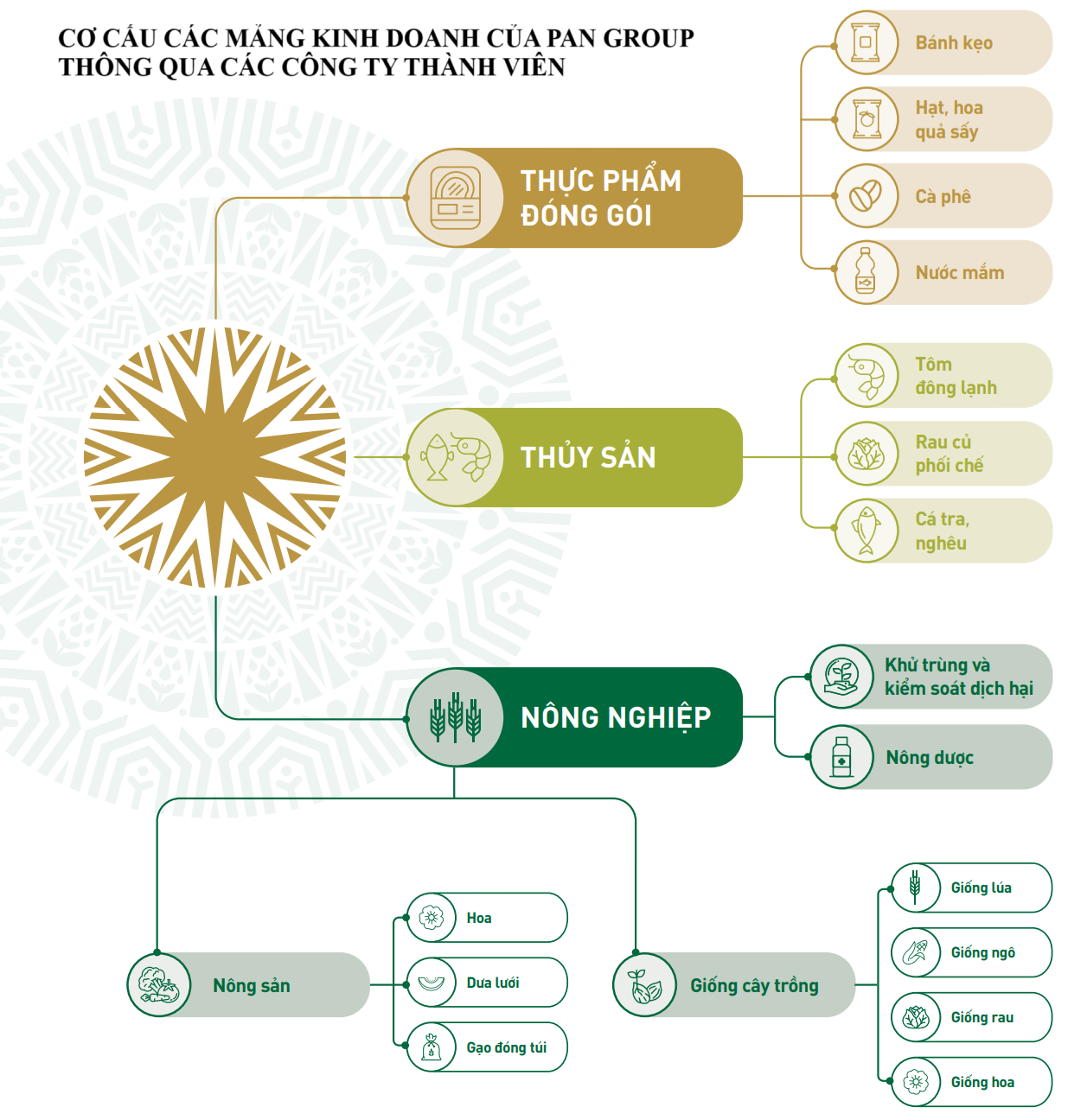 Trong đó, 9 công ty con do PAN Group sở hữu bao gồm: Công ty CP PAN Farm, Công ty CP Thực phẩm PAN (Pan Food), Công ty CP Thực phẩm Sao Ta, Công ty CP Thức phẩm An Khang, Công ty CP Cà phê Golden Beans, Công ty CP Chế biến Hàng xuất khẩu Long An, Công ty CP Xuất nhập khẩu Thủy sản Bến Tre, Công ty CP Bibica và Công ty CP Thủy sản 584 Nha Trang.