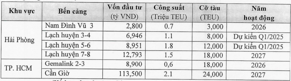 Cùng với đó, hàng loạt cảng nước sâu khác như Lạch Huyện 3-4, Lạch Huyện 5-6, Gemalink 2A và Nam Đình Vũ giai đoạn 3 đều được triển khai hoặc chuẩn bị đưa vào vận hành trong giai đoạn từ năm 2025-2027.