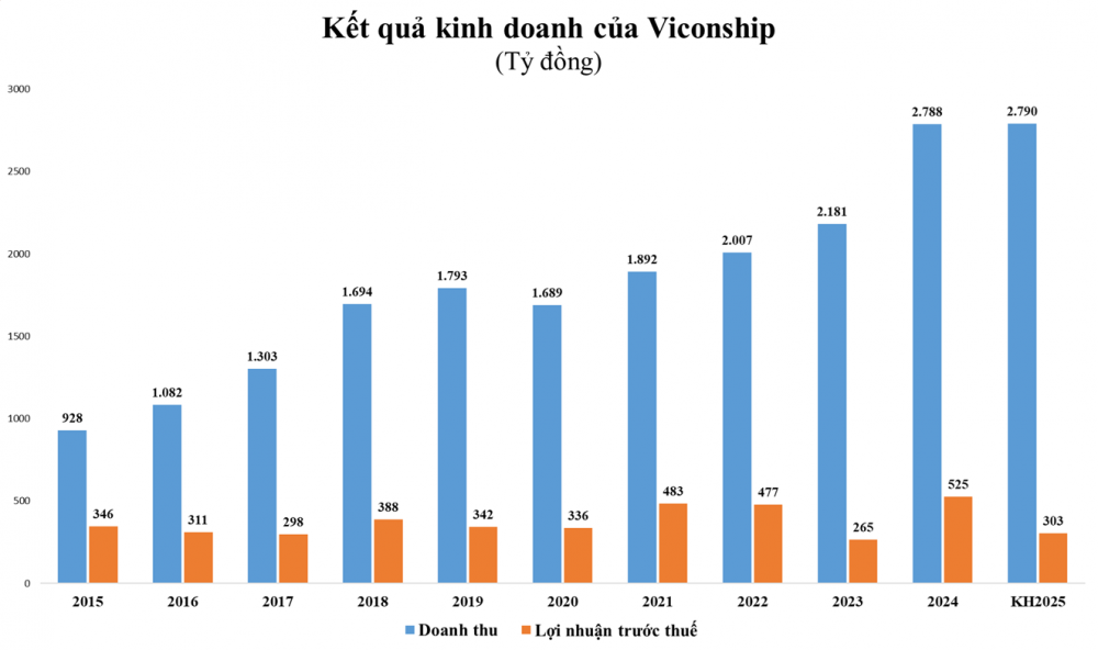 Theo tài liệu công bố, năm 2025 Viconship đặt mục tiêu doanh thu đạt 2.790 tỷ đồng, tăng nhẹ 0,1% so với năm 2024 nhưng lợi nhuận trước thuế mục tiêu lại giảm 42,2%, xuống 303 tỷ đồng.