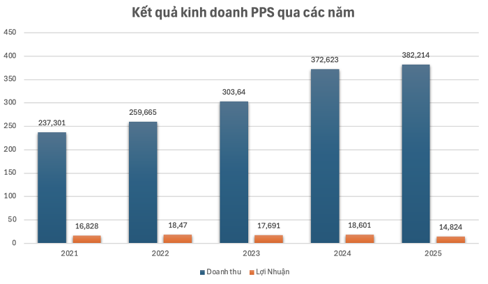 Theo báo cáo tài chính năm 2025 của PPS đã được CPA Việt Nam kiểm toán, doanh nghiệp này cps doanh thu thuần về bán hàng và cung cấp dịch vụ đạt hơn 382,2 tỷ đồng, tăng nhẹ so với mức 372,6 tỷ đồng của năm 2024. Đây là năm thứ 5 liên tiếp doanh thu của doanh nghiệp ghi nhận sự tăng trưởng.