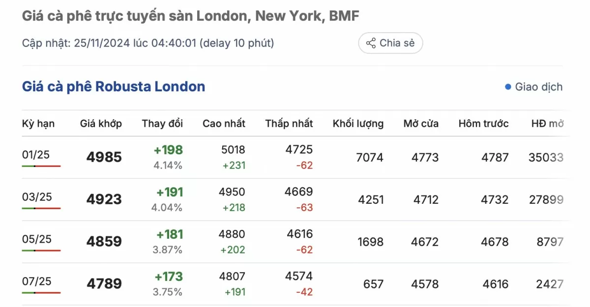 Kết thúc phiên giao dịch, giá cà phê Robusta trên sàn London lúc 4 giờ 30 phút ngày 25/11/2024 vẫn giữ mức giá so với phiên giao dịch ngày hôm qua 24/11 và ở mức từ 173 - 198 USD/tấn , dao động 4.574 - 5.018 USD/tấn. Cụ thể, kỳ hạn giao hàng tháng 1/2025 là 4,985 USD/tấn (tăng 198 USD/tấn); kỳ hạn giao hàng tháng 3/2025 là 4,923 USD/tấn (tăng 191 USD/tấn); kỳ hạn giao hàng tháng 5/2025 là 4,859 USD/tấn (tăng 181 USD/tấn) và kỳ hạn giao hàng tháng 7/2025 là 4,789 USD/tấn (tăng 173 USD/tấn).