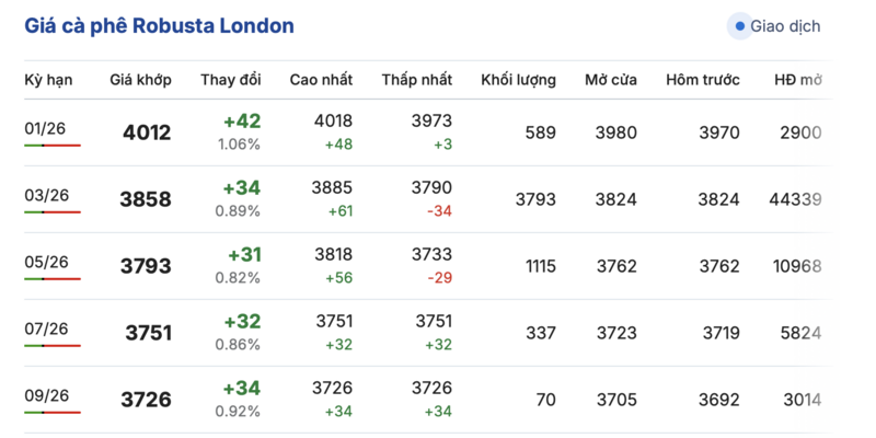 Kết thúc phiên giao dịch gần nhất, giá cà phê Robusta tại London tiếp tục tăng nhẹ đồng loạt trong các kỳ giao hàng. Cụ thể, kỳ giao tháng 1/2026 tăng 42 USD/tấn, lên mức 4012 USD/tấn. Hợp đồng giao kỳ hạn tháng 9/2026 tăng 34 USD/tấn, lên mức 3726 USD/tấn.