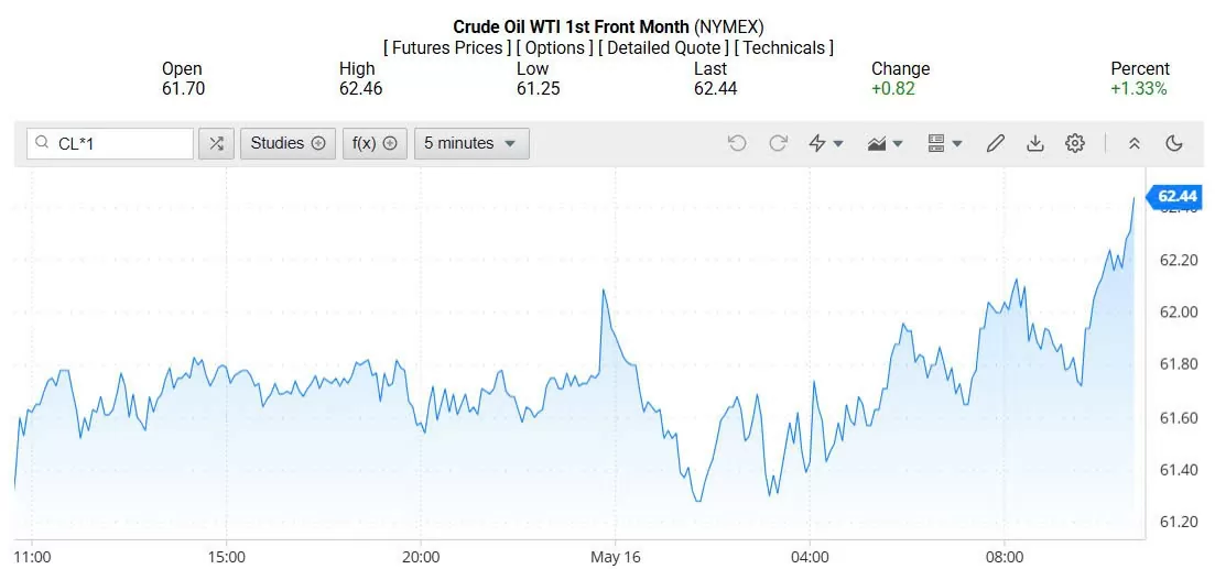 Tương tự, giá dầu WTI ở mốc 62,44 USD/thùng, tăng 1,33% (tương đương tăng 0,82 USD/thùng).