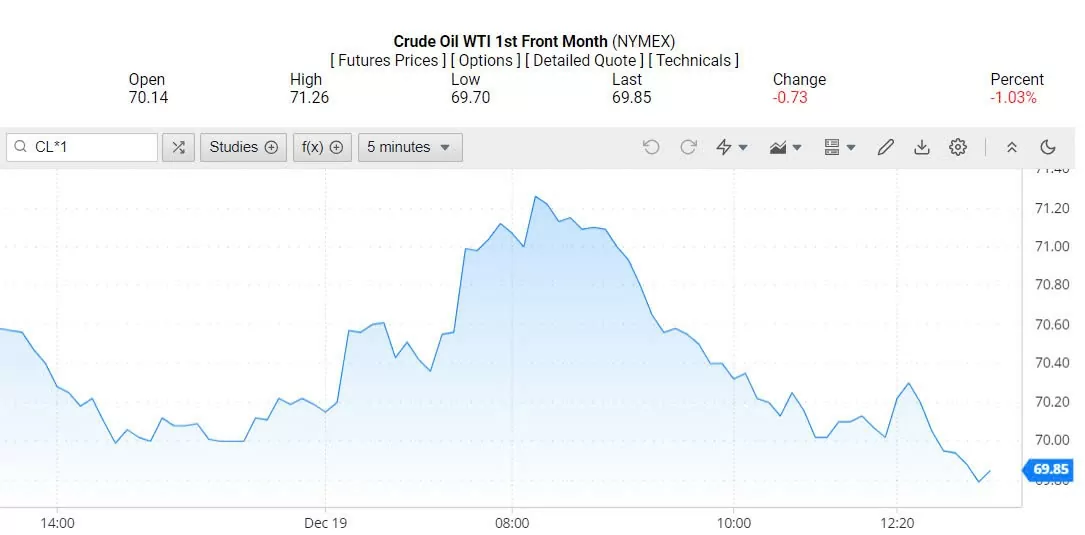 Giá dầu thô Brent tương lai giảm 51 cent, tương đương 0,7%, đóng cửa ở mức 72,88 USD/thùng. Giá dầu thô tương lai West Texas Intermediate của Hoa Kỳ giao tháng 1 giảm 67 cent, tương đương 1%, xuống còn 69,91 USD/thùng và hết hạn khi thanh toán. Hợp đồng WTI tháng 2 hoạt động tích cực hơn giảm 64 cent, xuống còn 69,38 USD/thùng.