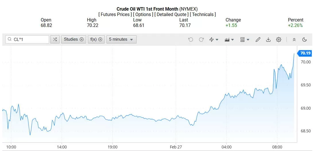Ghi nhận trên Oilprice lúc 4h ngày 28/02/2025 (theo giờ Việt Nam), giá dầu WTI ở mốc 70,19 USD/thùng, tăng 2,26% (tương đương tăng 1,55 USD/thùng).