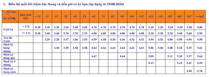 Ngoài ra, tiền gửi kỳ hạn dưới 1 tháng vẫn duy trì lãi suất ổn định ở mức 0,5%/năm, áp dụng đối với tất cả các khoản tiền gửi dưới 2 tỷ đồng và từ 2 tỷ đồng trở lên.