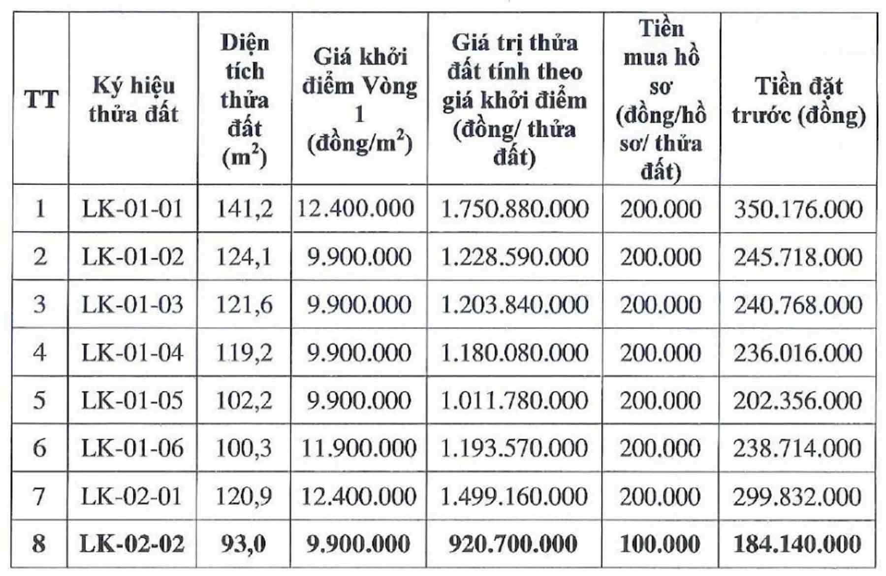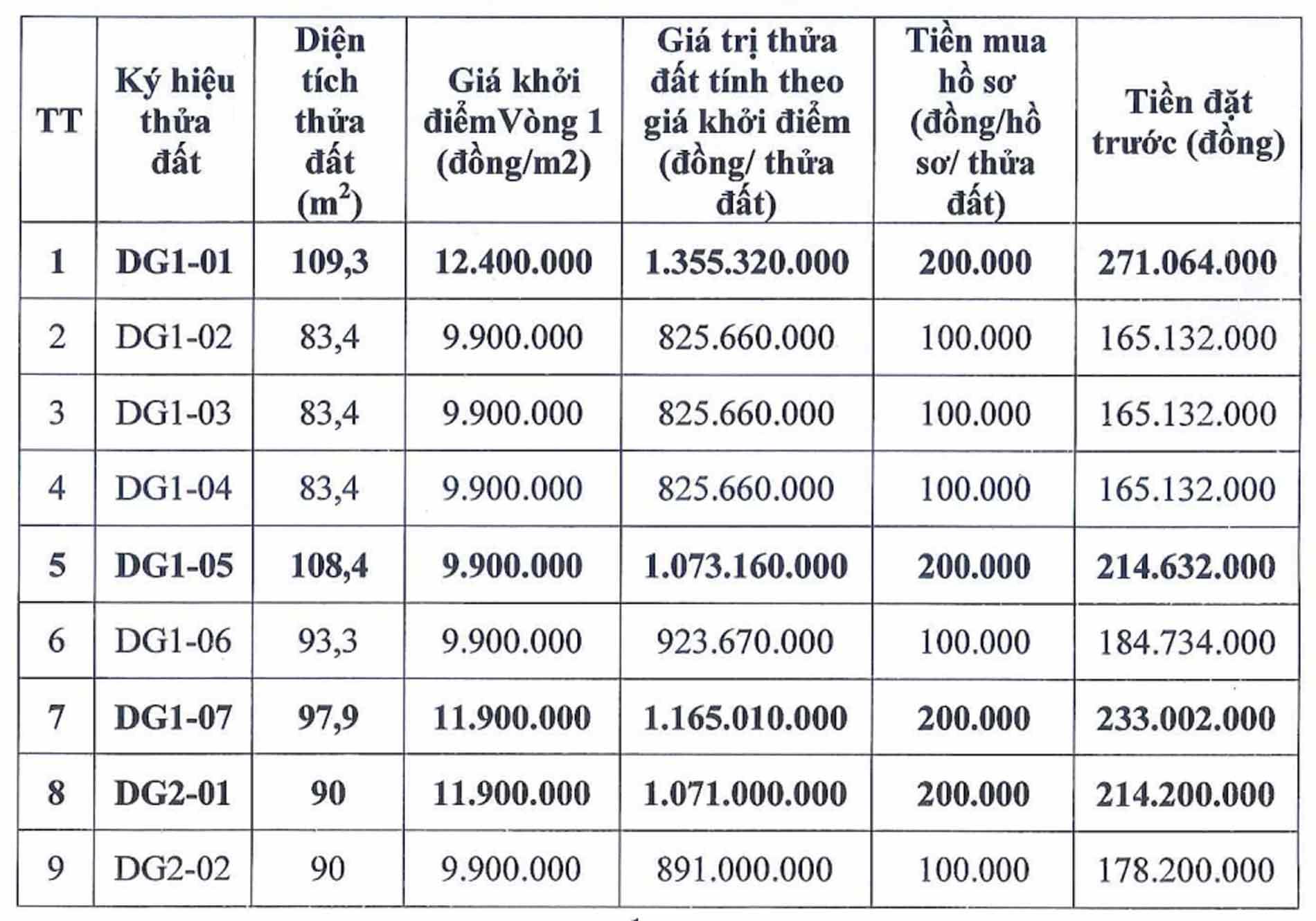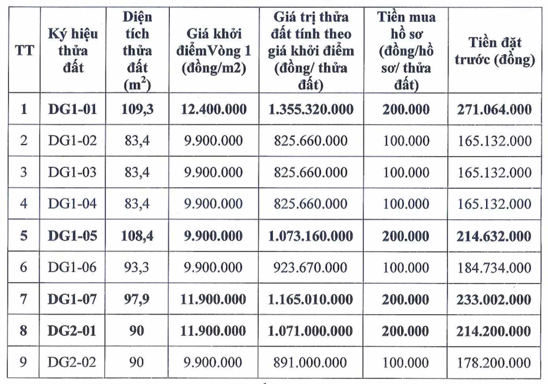 Các thửa đất có diện tích từ 83,4 - 122,1m2, giá khởi điểm đối với các thửa đất dao động từ 9,9 - 12,4 triệu đồng/m2.