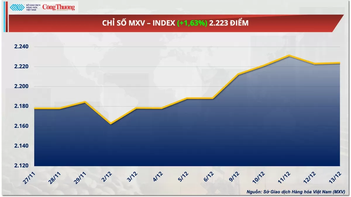 Theo Sở Giao dịch Hàng hóa Việt Nam (MXV),thị trường hàng hóa nguyên liệu thế giới tiếp tục biến động mạnh trong tuần giao dịch vừa qua (9 - 15/12) . Trong đó, nhóm năng lượng ghi nhận tuần tăng giá đáng chú ý khi toàn bộ 5 mặt hàng đồng loạt khởi sắc, dẫn dắt đà tăng của toàn thị trường. Ca cao cũng là điểm sáng của nhóm nguyên liệu công nghiệp với mức tăng vọt gần 15%, chạm đỉnh 8 tháng và nối dài chuỗi tăng sang tuần thứ 5 liên tiếp. Đóng cửa tuần, lực mua chiếm ưu thế đã kéo chỉ số MXV-Index tăng 1,63% lên 2.223 điểm.