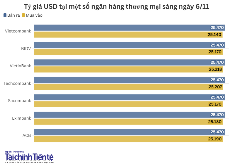 Giá mua - bán đồng bạc xanh được hầu hết các ngân hàng niêm yết ở mức 25.470 VND/USD, với diễn biến tăng từ 10 - 20 đồng so với chốt phiên cuối hôm qua (ngày 5/11).