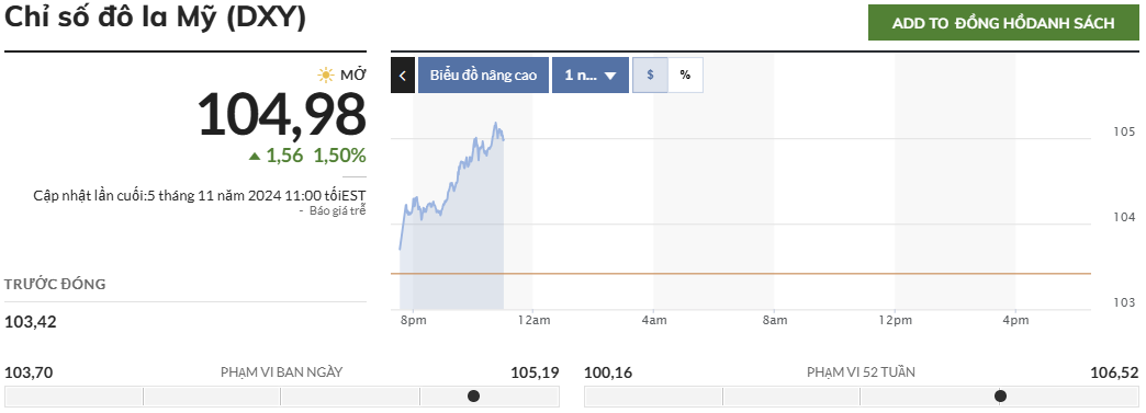 Chỉ số DXY tăng vọt lên mức cao nhất trong 14 tuần, tiến sát mốc 105 điểm do thị trường phản ứng với kết quả sơ bộ trong cuộc bầu cử tổng thống Mỹ, với phần thắng đang nghiêng về cựu tổng thống Donald Trump. Trong 4 tuần qua, chỉ số DXY đã tăng 2,08% và giảm 0,89% trong 12 tháng.