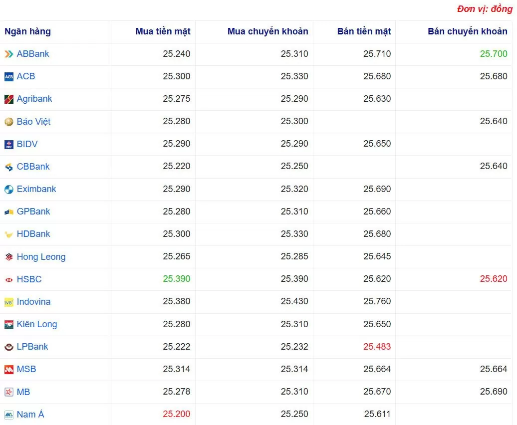 Ngân hàng HSBC đang bán chuyển khoản USD với giá thấp nhất là: 1 USD = 25.620 VND