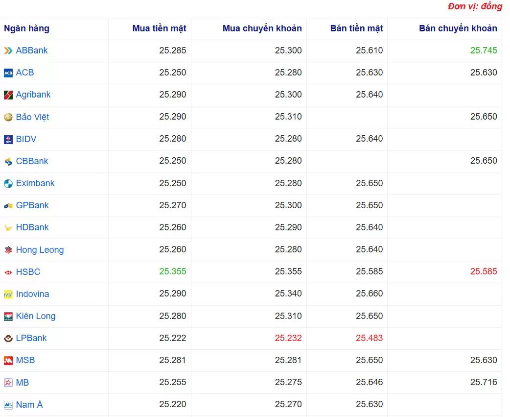 Ngân hàng HSBC đang bán chuyển khoản USD với giá thấp nhất là: 1 USD = 25.585 VND